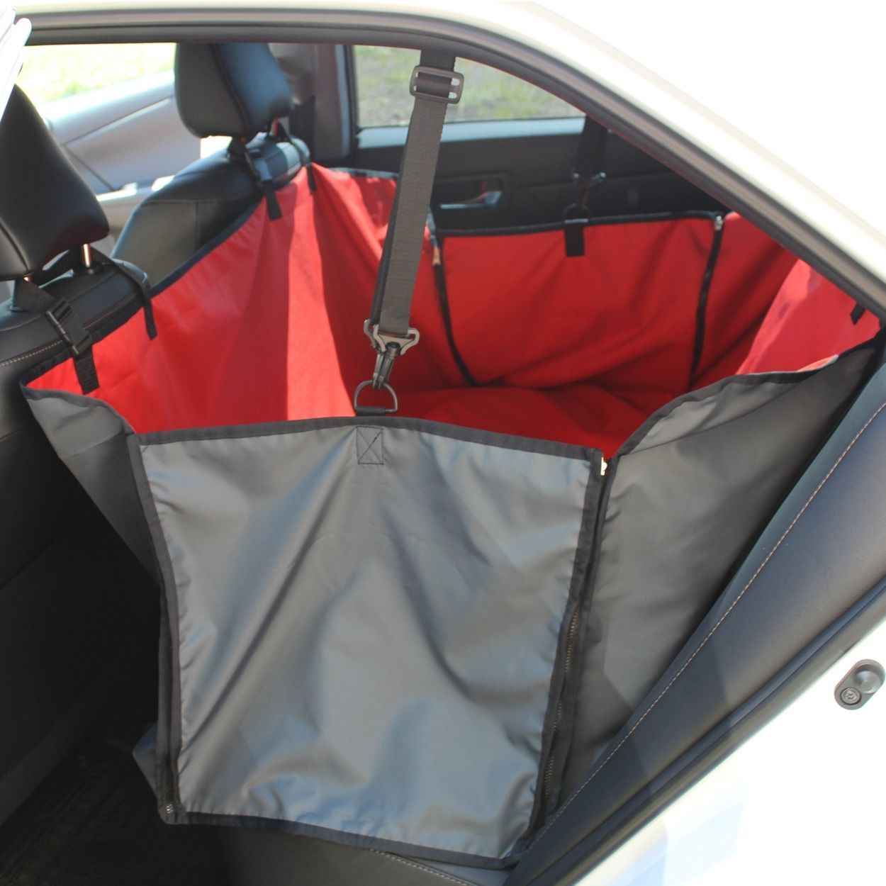 Автогамак оснащен боковой защитой дверей, которая закрывается на молнию с двух сторон. Благодаря этому, питомца можно посадить в автомобиль с любой стороны.